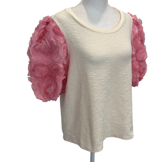 Maeve Anthropologie Ivory and Pink Tulle Puff Short Sleeve Top Womens Size Large