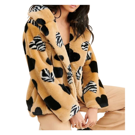 Anthropologie Maeve Faux Fur Coat Tan, Black and Zebra Hearts Womens Size Medium