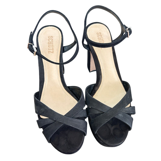 Schutz Keefa Platform Strappy Sandal Heels Black Nubuck Leather Womens Size 9 B