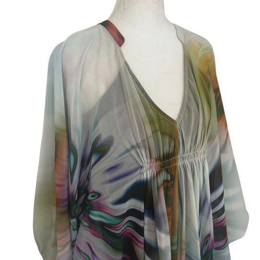 Maggy London Grey Gold Green Purple Mini Kaftan Boho Tunic Dress Womens Size 6