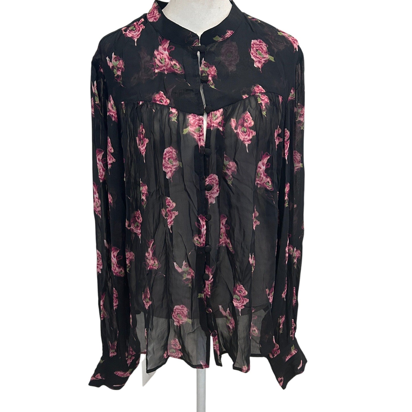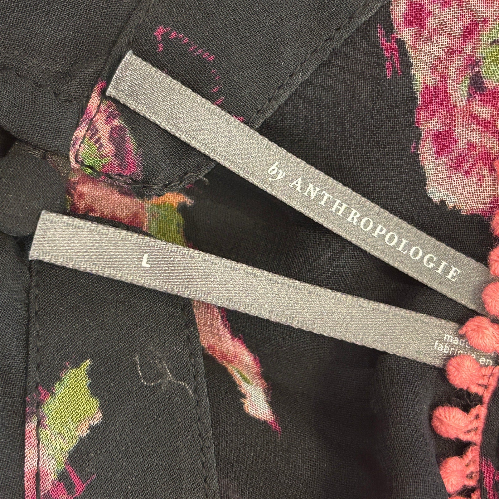 Anthropologie Black and Pink Floral Sheer Boho Flowy Blouse Womens Size Large