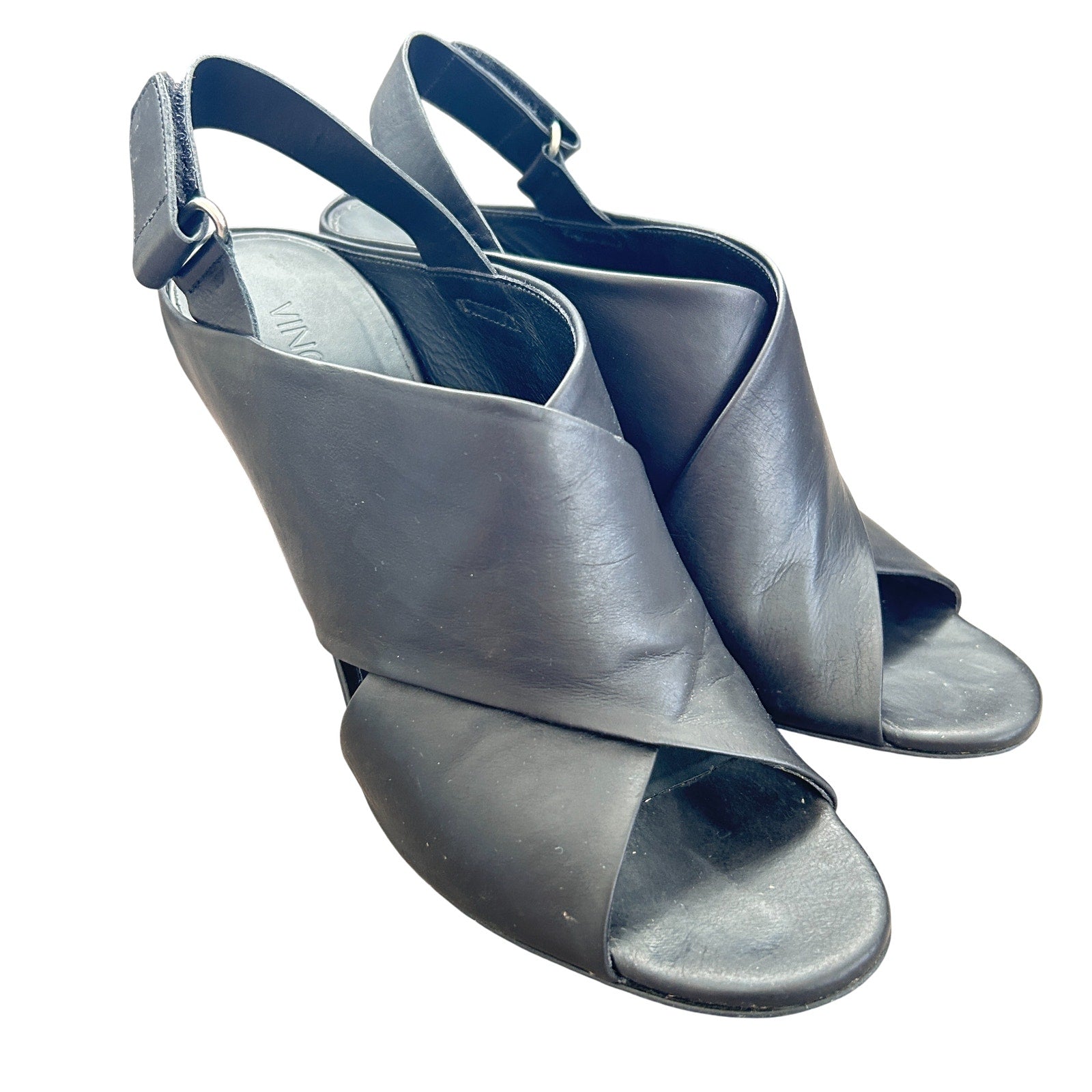 Vince Faine Black Leather Open Toe Slingback Block Heel Sandal Shoes